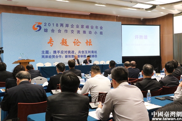 中國臺灣網12月5日廈門訊(記者 李奕均 劉川) 4日下午,主題為“攜手應對挑戰·共創互利商機”的“綜合合作交流推動小組”專題論壇在廈門國際會議中心舉行。該論壇是“2018兩岸企業家峰會年會”所舉辦的專題論壇之一,兩岸企業家代表及媒體人員近200人參與了專題論壇活動。在主旨發言中,兩岸代表圍繞“31條惠及臺灣同胞措施”展開關于共創互利商機的討論。