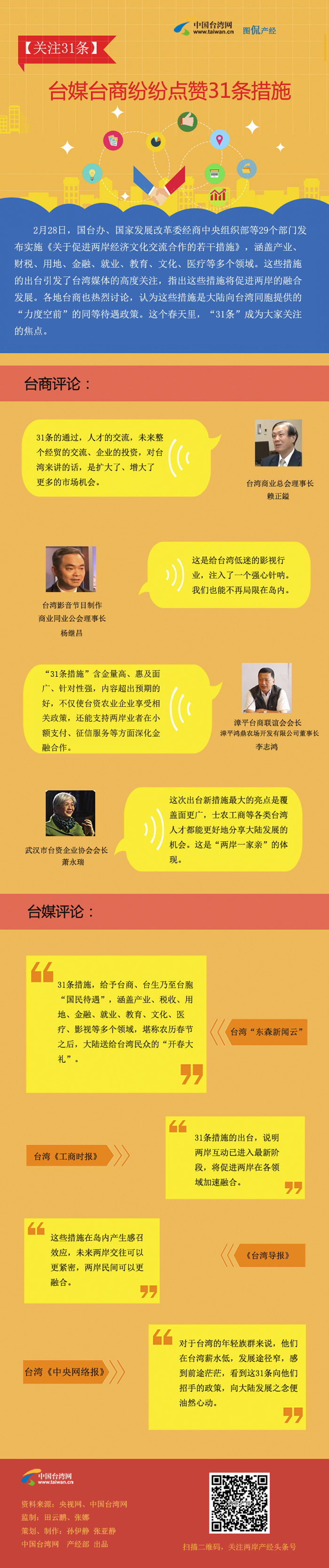 2月28日,國(guó)臺(tái)辦、國(guó)家發(fā)展改革委經(jīng)商中央組織部等29個(gè)部門(mén)發(fā)布實(shí)施《關(guān)于促進(jìn)兩岸經(jīng)濟(jì)文化交流合作的若干措施》,涵蓋產(chǎn)業(yè)、財(cái)稅、用地、金融、就業(yè)、教育、文化、醫(yī)療等多個(gè)領(lǐng)域。這些措施的出臺(tái)引發(fā)了臺(tái)灣媒體的高度關(guān)注,指出這些措施將促進(jìn)兩岸的融合發(fā)展。各地臺(tái)商也熱烈討論,認(rèn)為這些措施是大陸向臺(tái)灣同胞提供的“力度空前”的同等待遇政策。這個(gè)春天里,“31條”成為大家關(guān)注的焦點(diǎn)。