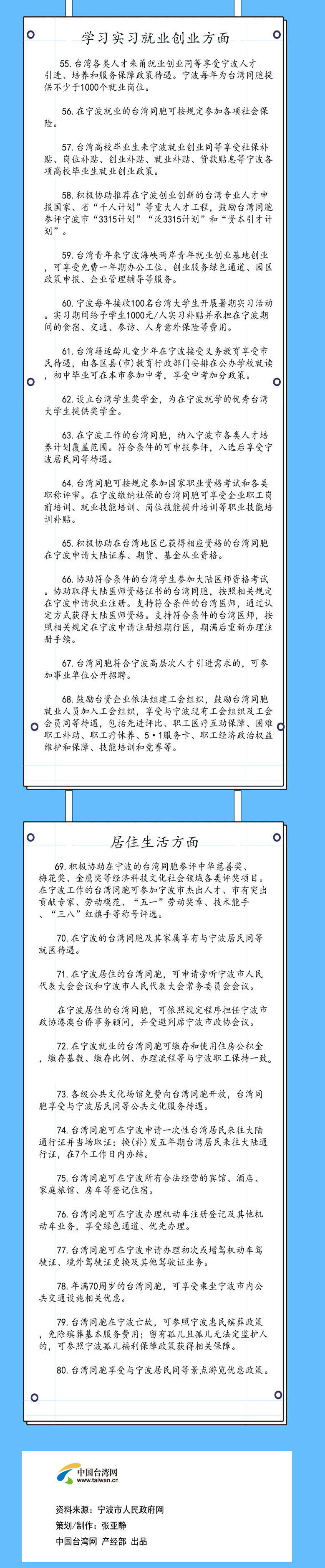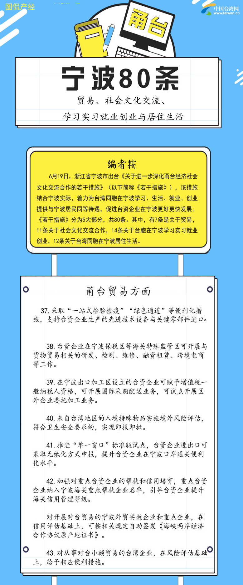 編者按:6月19日,浙江省寧波市出臺《關于進一步深化甬臺經濟社會文化交流合作的若干措施》(以下簡稱《若干措施》),該措施結合寧波實際,著力為臺灣同胞在寧波學習、生活、就業、創業提供與寧波居民同等待遇,促進臺資企業在寧波更好更快發展。《若干措施》分為5大部分,共80條。其中,有7條是關于貿易,11條關于社會文化交流合作,14條關于臺胞在寧波學習實習就業創業,12條關于臺灣同胞在寧波居住生活。