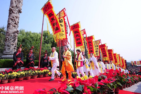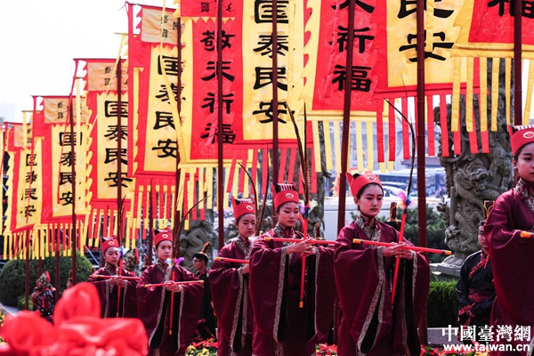 祈福盛典全程遵循古禮,分為迎神、奠玉帛、進(jìn)俎、行初獻(xiàn)禮、行亞獻(xiàn)禮、行終獻(xiàn)禮、敬獻(xiàn)花籃等環(huán)節(jié)。共同敬天祈福,祈求國泰民安,兩岸攜手打造海峽兩岸文化交流盛會,極大增強(qiáng)了中華民族的凝聚力和全球華人的民族自豪感。