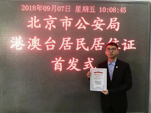 得知自己是北京首位申領臺灣居民居住證的臺胞,他表示非常開心,“畢竟是第一張‘臺灣居民居住證’,覺得很榮耀”。鄭博宇說,拿到證件以后,感覺與一般的北京市民就沒有什么差別了,很開心拿到了證件,以“同胞”的身份在這里發展。