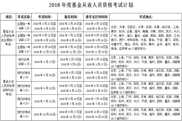 基金從業資格考試分為全國統考和預約式考試兩種形式,中國證券投資基金業協會2018年度考試計劃中,基金從業人員資格考試全國統一考試3次,預約式考試5次。具體時間安排如下圖所示。