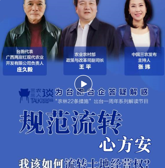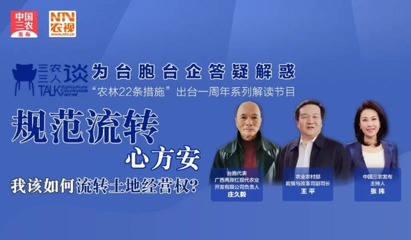 農(nóng)業(yè)農(nóng)村部政策與改革司王平副司長做客演播室同時(shí),還邀請臺(tái)胞代表廣西兩岸紅現(xiàn)代農(nóng)業(yè)開發(fā)有限公司負(fù)責(zé)人莊久毅通過在線互動(dòng)的方式參與話題討論