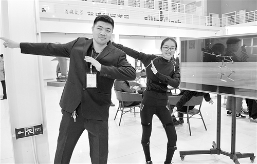 東北大學“無線動作捕捉傳感器”項目創始人龔佳樂(左)及其團隊成員李琪(右)在投資洽談會上展示“無線動作捕捉傳感器”(10月19日攝)。新華社記者 許 暢攝