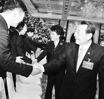 圖為中國僑商投資企業協會科技創新委員會第一屆會員大會上,國務院僑辦主任裘援平(中)與參會人員親切握手。