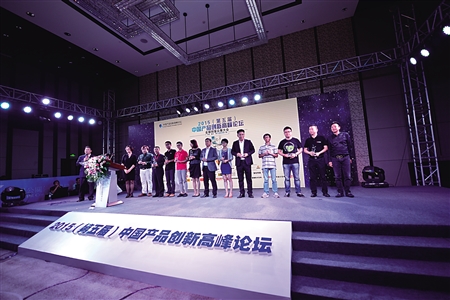 昨日,“2015(第五屆)中國產品創新高峰論壇暨全球創客眾籌大會”現場獲獎企業代表登臺領獎。 主辦方供圖