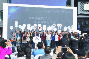 36家創(chuàng)業(yè)服務機構代表在中關村創(chuàng)業(yè)大街分會場啟動儀式上,共同為創(chuàng)業(yè)者點贊。