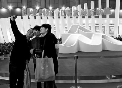 昨天,參觀者用手機自拍功能跟雙創(chuàng)標識合影。 本報記者 吳鏑攝