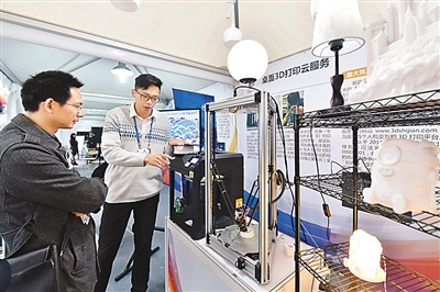 圖為創新創業者介紹3D打印技術。