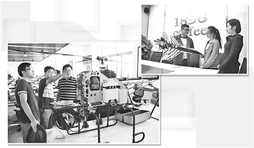左下圖 蘭州科技大市場(chǎng)投入運(yùn)營(yíng)當(dāng)天,一家企業(yè)展示的無(wú)人機(jī)吸引眾多同行業(yè)創(chuàng)客關(guān)注。 右上圖 在眾創(chuàng)空間的1898咖啡館內(nèi),甘肅啟遠(yuǎn)智能科技公司工作人員正與另外幾名創(chuàng)客交流航模制作經(jīng)驗(yàn)。照片由本報(bào)記者 陳發(fā)明攝