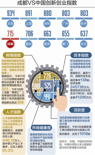 此次首度公布的300余城市名單中,成都排名第六。記者獲悉,位列前十的城市分別為:北京、上海、深圳、廣州、杭州、成都、重慶、南京、廈門和長沙。成都的雙創指數約為715,最高的北京為934。