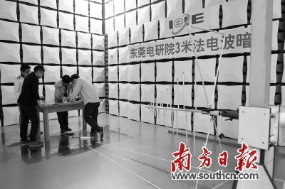 4日,在電研院的電磁兼容公共實驗室內(nèi),記者看到石龍鎮(zhèn)富華電子所生產(chǎn)的電源適配器正進行電磁輻射檢測:工程師在密閉的實驗室內(nèi)開啟電源適配器后,在另一個房間內(nèi)實時監(jiān)測電磁輻射數(shù)據(jù)。