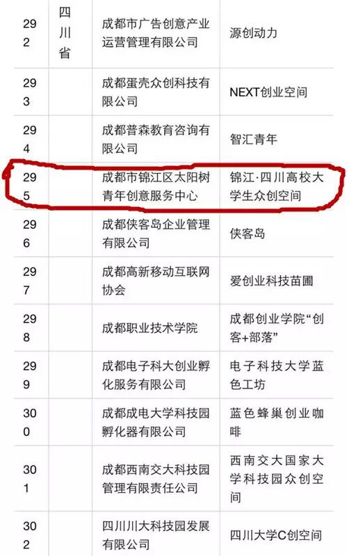 四川省入圍11家分別是源創動力、NEXT創業空間、智匯青年、錦江.四川高校大學生眾創空間、俠客島、愛創業科技苗圃、成都創業學院“創客+部落”、電子科技大學藍色工坊、藍色蜂巢創業咖啡、西南交大國家大學科技園眾創空間、四川大學C創空間。