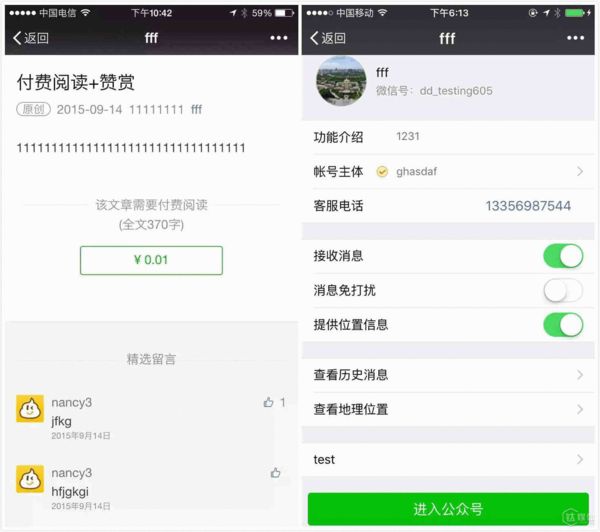 截圖來自于一個名叫『fff』的測試賬號,根據這個賬號歷史消息內容,以及信息亂填能夠獲得認證等證據來看,此賬號應該是屬于微信官方。基于此可判定,不論是否上線,『付費閱讀』功能進入測試階段已是無疑。