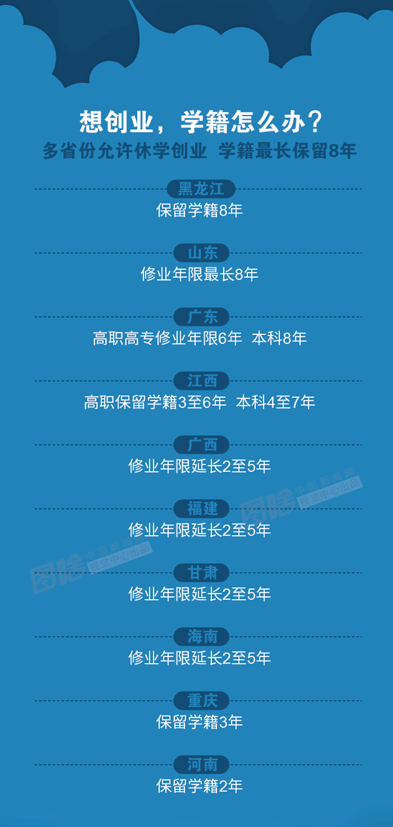 黑龍江、山東、廣東、江西、廣西、福建、甘肅、海南等多個(gè)省份出臺(tái)政策明確大學(xué)生在校期間修業(yè)年限,其中廣東、江西對(duì)高職高專也作出了規(guī)定,廣東高職高專延長休學(xué)創(chuàng)業(yè)年限至6年、江西高職為3-6年。陜西、貴州、四川、上海、內(nèi)蒙古、湖北、湖南、天津、吉林、安徽、云南、河北等多個(gè)省份也允許實(shí)施彈性學(xué)制,保留學(xué)籍休學(xué)創(chuàng)業(yè),但未給出具體修業(yè)年限。
