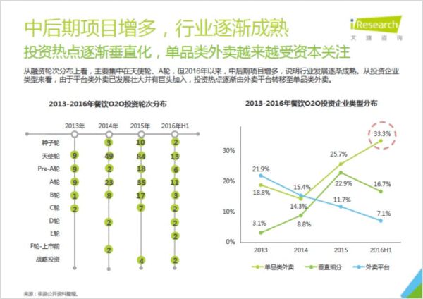 外賣O2O依然處于井噴階段,用戶的消費能力增加也導致了其從價格敏感轉向了品質敏感,也在反過來倒逼整個外賣行業的質量提升,安全、餐飲品類、物流等等通通需要全面的提升,單品和垂直類外賣之所以在后期受到投資青睞正是因為其能夠更為專注的做到從安全到物流的各項品質服務,而其服務的用戶也偏中高端,有著更高的消費能力與黏性,可以最早實現盈利,繼而成為投資的新寵。