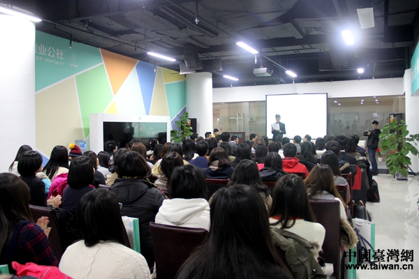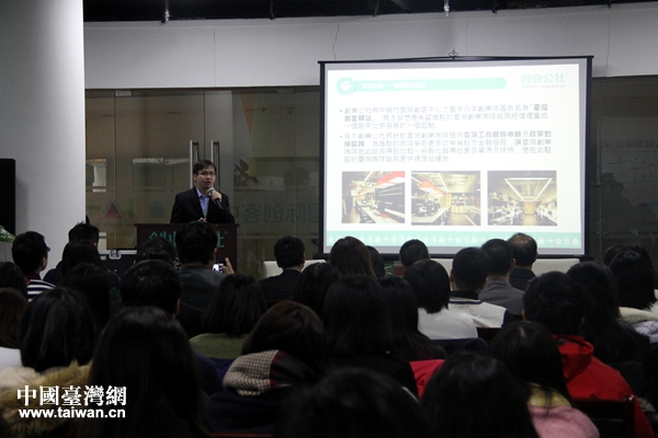 創(chuàng)業(yè)公社臺(tái)灣專區(qū)負(fù)責(zé)人鄭博宇向臺(tái)灣青年們介紹“臺(tái)灣創(chuàng)客驛站”。(中國臺(tái)灣網(wǎng) 吳曉寒 攝)