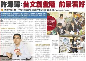 2016年8月27日,由《旺報》主辦的“2016第一屆兩岸青年創業論壇”在中國臺灣省新北市舉辦,91投資、91眾創空間、91金融董事長許澤瑋受邀出席并作主題演講。許澤瑋表示,在創新創業合作上,兩岸三地生態優勢互補,大陸人善于學習、有創新精神,而臺灣人靈活、有創意、懂生活。非?春门_灣文創產業到大陸發展的前景。