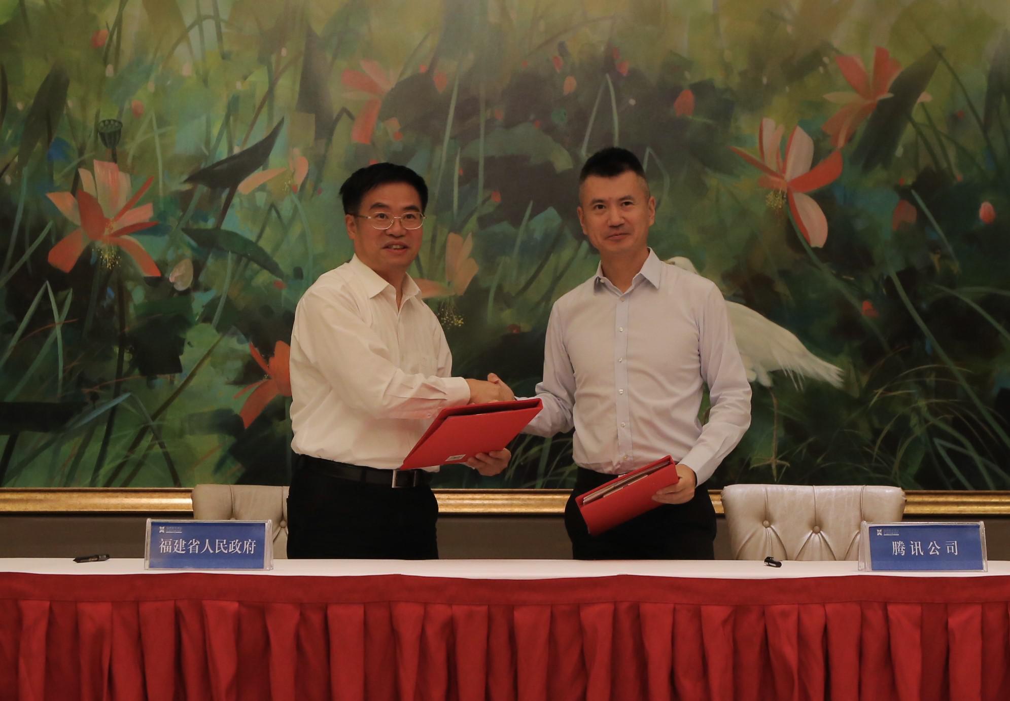 福建省副省長周聯清(左)、騰訊公司首席運營官任宇昕(右)簽署戰略合作協議