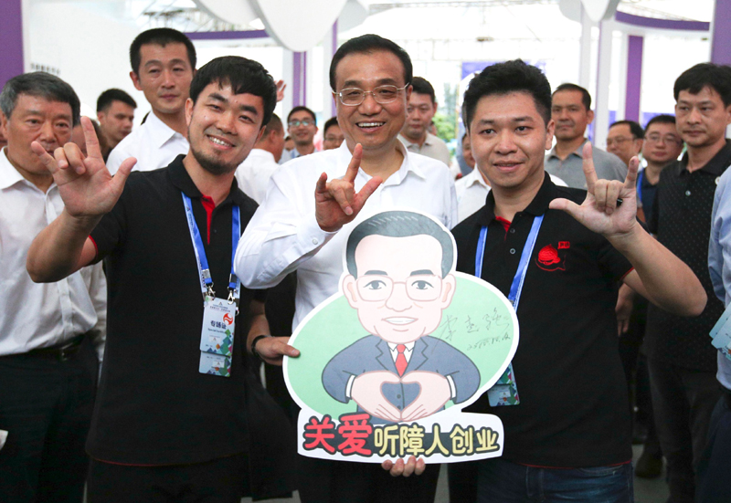 【李克強用“愛”的手勢為聽障創業團隊加油】“總理,我們這個手勢是聽障人國際手勢,表示‘愛’的意思!痹谝晃宦犝蟿摌I團隊負責人示范下,總理也打出同一手勢。這是12日下午全國雙創周深圳主會場上動人的一幕。李克強對這一創業團隊給予特殊關注,并應邀在“關愛聽障人創業”畫板上簽上自己的名字。