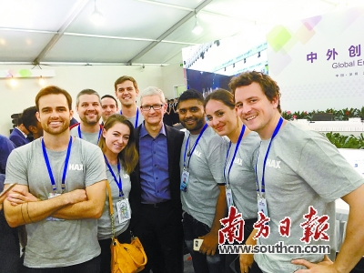 在10月12日下午召開的中外創客領袖座談會上,來自HAX孵化器的約10名國際創客在座談會上分享最新成果,暢談發展理念。在會議間隙,這些國際創客還“逮”住蘋果公司CEO蒂姆·庫克合影。