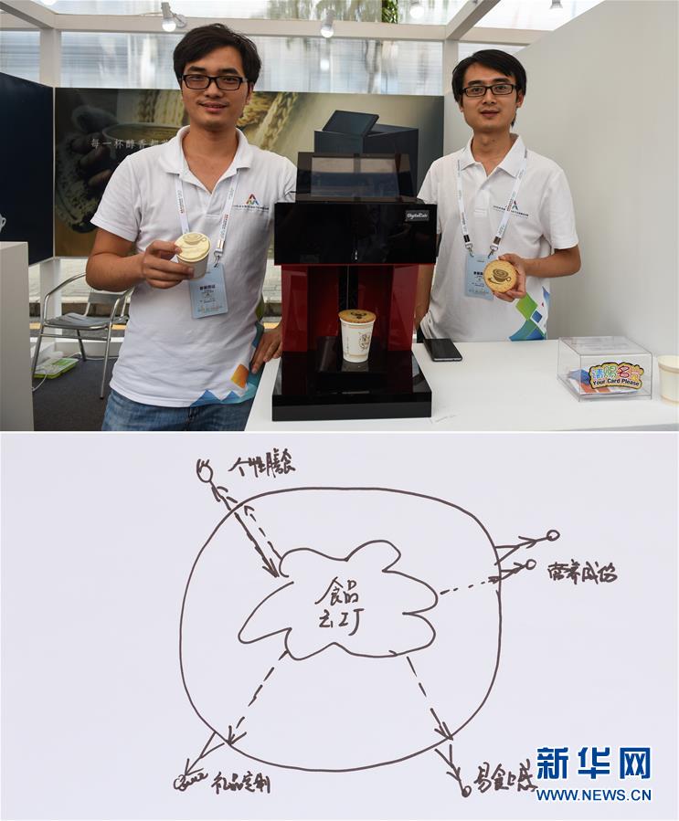 上圖:10月13日,來自深圳膳云科技公司的李響(右)和王傳建展示他們研發的咖啡拉花機,這臺機器在10秒之內就可在咖啡泡沫或者餅干上打印出想要的任意圖案;下圖:李響繪圖表示,希望能做一個食品云工廠,可以根據家人的身體狀況與需求在工廠定制食品,再由最近的加工店做好安全美味的食物送往家人住處(拼版照片)。 新華社記者毛思倩攝