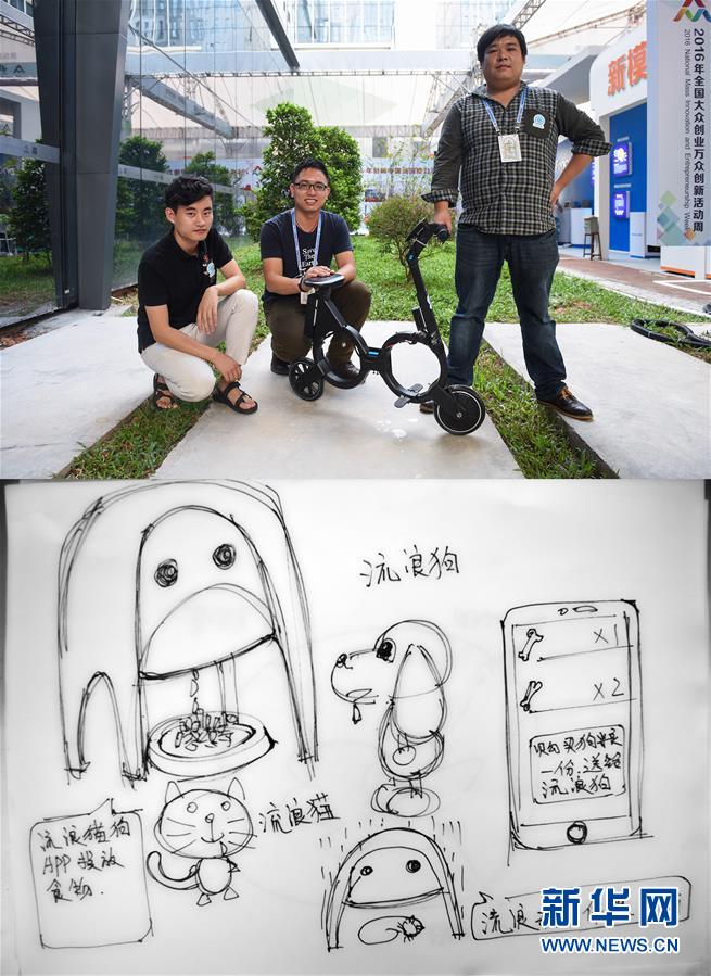 上圖:10月13日,來自不可能科技(深圳)有限公司的董世豪、李明和尹銳(從左到右)展示impossible智能背包車,他們自主研發的這款車折疊后可以收納進雙肩包,整車僅重7公斤,電池續航達20公里;下圖:董世豪繪圖表示,希望能做一個自動流浪貓狗喂食器,機器設置在流浪貓狗長期出沒的位置,愛心人士可以通過app給貓狗購買貓糧或狗糧投喂(拼版照片)。新華社記者毛思倩攝