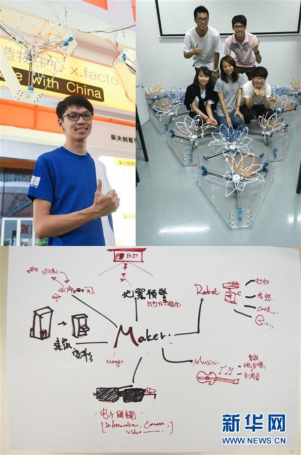 左上:10月13日,來自馬來西亞、在臺灣云林科技大學數位媒體設計系學習的李勇勝在深圳柴火創客空間交流學習時留影(新華社記者毛思倩攝);右上:李勇勝和團隊與他們參與設計的一款名為“動態云”的互動裝置,彈性的裝置設計以人為傳感元,當參與者接近時收縮,離開時放松(受訪者供圖);下圖:李勇勝繪圖表示,希望未來能做很多東西,包括可以自動演奏的吉他,攜帶式服務機器人,地震預警與方向指示裝置,騎車時形狀為雨衣、不騎車就會變形為雨傘的兩用傘,可以自己變形的建筑等(新華社記者毛思倩攝,拼版照片)。新華社發