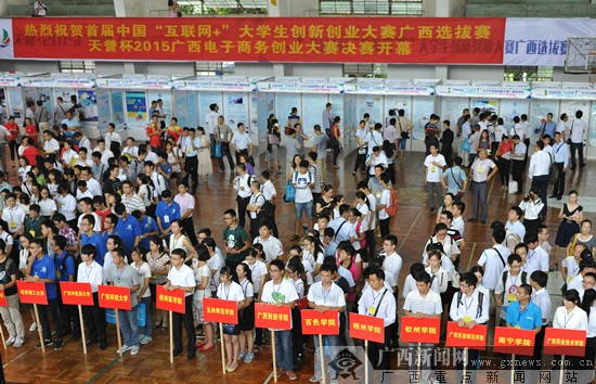 目前廣西區賽共計43個院校報名,其中990個項目團隊參加首屆“互聯網+”大學生創新創業大賽,585個團隊參加電子商務創業大賽,雙賽共計1575個項目團隊參賽,參賽學生達7875人。