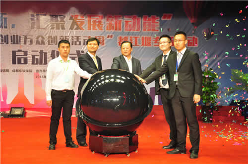 都江堰市委副書記、市長何維楷和成都東軟學院黨委書記、院長張應輝及學院3位創業學生代表一同為2015年“全國大眾創業萬眾創新活動周”都江堰專場活動揭開序幕