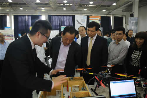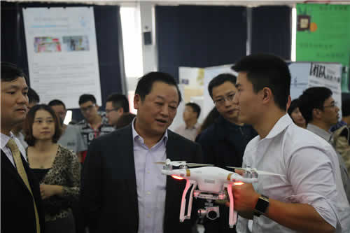 都江堰市委副書記、市長何維楷在學院黨委書記、院長張應輝陪同下參觀參展創業項目