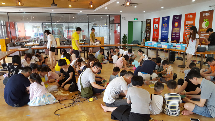 6月5日下午,一品創客集孵化美基地與小玩伴機器人創客空間聯合舉行了“親子科技周·親子游樂大比拼”活動。雖然天公不作美,下起了大雨,但是依舊擋不住家長和小朋友們的熱情,現場人氣爆棚。大、小朋友在咖啡廳進行了一場場科技大比拼。