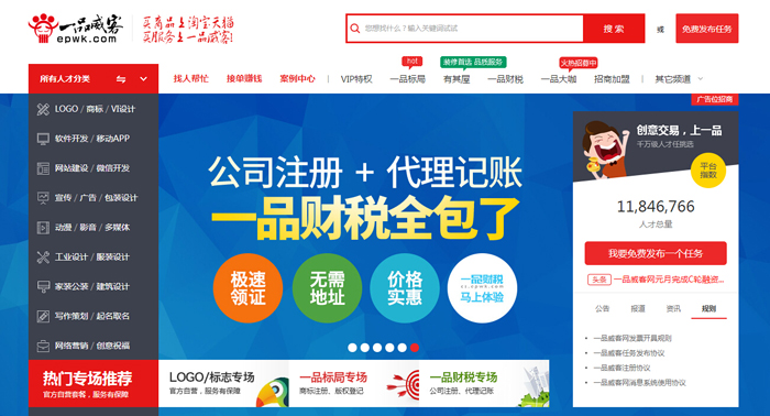 對于一個公司或企業來說,從其誕生到發展的整個過程中,與之相關的的品牌營銷、公司創建、傳播推廣、網站建設、商標注冊、法律服務甚至是融資等等,除了生產制造之外的環節,都可以在一品威客網平臺上完成。