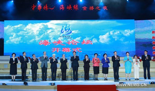 Jia Qinglin(8th R), member of the Standing Committee of the Political Bureau of the Communist Party of China (CPC) Central Committee and chairman of the National Committee of the Chinese People's Political Consultative Conference (CPPCC), attends the opening ceremony of the second Strait Forum in Xiamen, southeast China's Fujian Province, on June 19, 2010(Xinhua/Pang Xinglei)