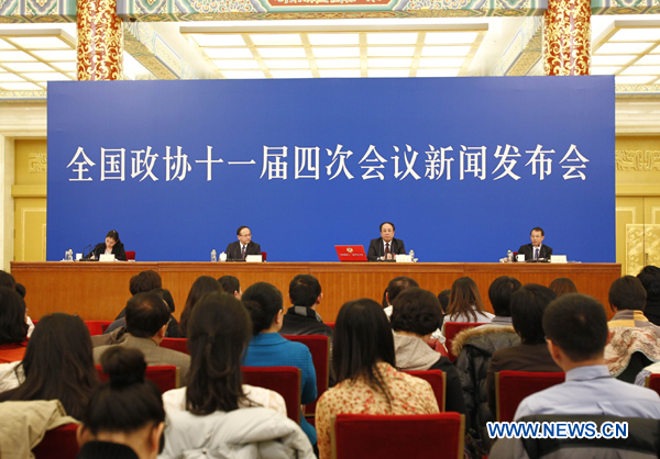 Zhao Qizheng (2nd R), spokesman of the Fourth Session of the 11th Chinese People's Political Consultative Conference (CPPCC) National Committee, speaks during a news conference on the CPPCC session at the Great Hall of the People in Beijing, capital of China, March 2, 2011. The Fourth Session of the 11th CPPCC National Committee is scheduled to open on March 3. (Xinhua/Chen Jianli) |