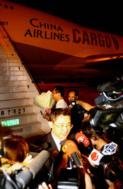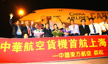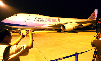 A Boeing 747-400 from China Airlines, Taiwan's largest air carrier, landed in Pudong International Airport of Shanghai, east China, July 20, 2006. The first direct cargo charter flight from Taiwan touched down in Shanghai early Thursday morning, marking a breakthrough since 1949. [Xinhua Photo]