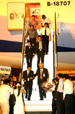 Crew walk out of the Boeing 747-400 from China Airlines, which land in Pudong International Airport of Shanghai, east China, July 20, 2006. [Xinhua Photo]