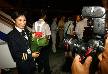 Mao Aiti, vice captain of the first direct cargo charter flight from Taiwan to mainland China poses for photographs in Pudong International Airport of Shanghai, east China, July 20, 2006. [Xinhua Photo]