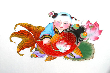 The themes expressed in New Year pictures cover a wide range, from plump babies holding a fish to the Old God of Longevity, from landscapes to birds and flowers, from the ploughing cattle in spring to rich harvests in autumn. Human figures often show artistic exaggeration, but the message in all pictures is always good luck , festivity or other nice things in the wish of the people. Usual objects in the pictures include the crane or the peach which symbolizes a long life, the plum or peony which is a mark of good fortune and happiness. The colours most favoured are red, green, purple, yellow and black-which are not only bright but contrast well with one another-intended to give fresh, vivid, pleasant and inspiring impressions.