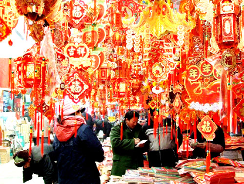 The expression explains itself. The Chinese people have the custom of sticking up pictures to celebrate the traditional New Year(which is also called the Spring Festival). This was recorded in historical works of the Song Dynasty (960-1279). The custom is particularly popular in the vast countryside, where just before the festival day every household will be busy spring cleaning and pasting colourful pictures or paper cuttings on their doors, windows, walls, even wardrobes and stoves.