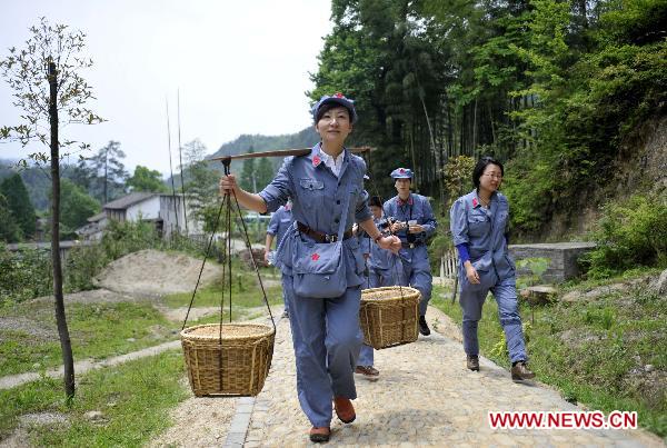 Students of China Executive Leadership Academy at Jinggangshan (CELAJ), wearing former Chinese Red Army uniforms, experience labor in Jinggangshan, east China's Jiangxi Province, April 29, 2011. (Xinhua/Qian Yi)