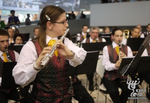 The Meyrin-Geneva Municipal Brass Band entertains visitors at the Geneva-Zurich-Basel Pavilion with a fusion of classic, jazz and modern rhyme.