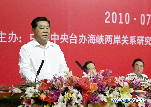 Jia Qinglin, chairman of the National Committee of the Chinese People's Political Consultative Conference, speaks during the closing ceremony of the sixth Cross-Strait Economic, Trade and Culture Forum in Guangzhou, capital of south China's Guangdong Province, July 11, 2010. The sixth Cross-Strait Economic, Trade and Culture Forum closed in Guangzhou on Sunday with the adoption of 22 joint proposals for the promotion of cross-Strait cooperation in various fields. (Xinhua/Ma Zhancheng)