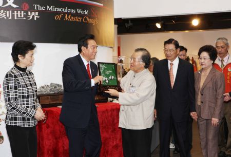 Chen Yunlin (2nd L), president of Chinese mainland's Association for Relations Across the Taiwan Straits (ARATS), exchanges souvenirs with a renowned sculptor at Sanyi Woodcarving Museum in Miaoli County, southeast China's Taiwan Province, on Dec. 23, 2009. Chen Yunlin visited the museum on Wednesday with the company of Taiwan's Straits Exchange Foundation (SEF) chairman Chiang Pin-kung in Sanyi Township, which is famous for its woodcarving industry. (Xinhua/Yuan Man)
