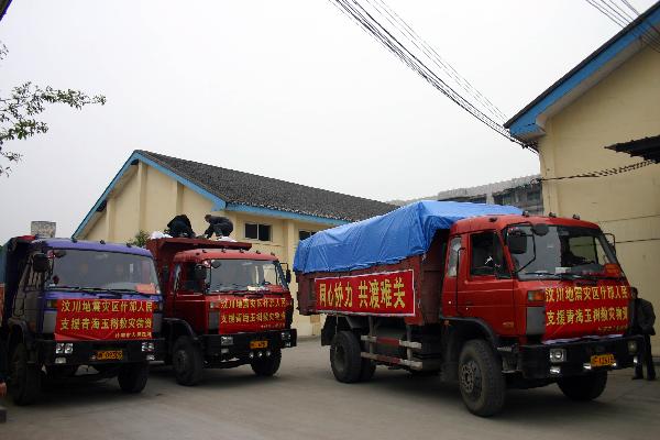 Trucks carrying relief goods for the quake-hit region of China's northwestern Qinghai Province depart from Shifang City, southwest China's Sichuan Province, April 16, 2010. A 7.1-magnitude quake struck the Tibetan Autonomous Prefecture of Yushu in Qinghai Province early on Wednesday. (Xinhua/Liu Hai)