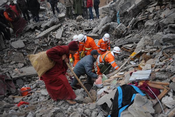 Rescuers and volunteers search for survivors among debris in earthquake hit Yushu County of northwest China's Qinghai Province, April 16, 2010. The rescuers have been doing unremitting efforts to save people's lives during the "golden 72 hours" since the 7.1-magnitude quake struck Yushu early Wednesday. (Xinhua/Nie Jianjiang)