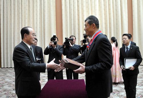 授勛儀式3日在平壤萬壽臺議事堂舉行。朝鮮最高人民會議常任委員會委員長金永南宣讀了政令,并給劉曉明佩戴勛章。