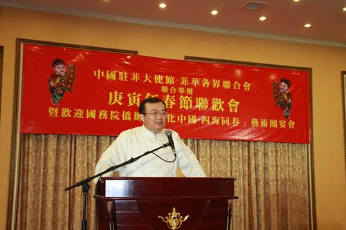 當天晚上,中國駐菲律賓大使館和菲華各界聯(lián)合會舉辦盛大的聯(lián)歡晚宴,歡迎藝術團的到來。菲華各界聯(lián)合會主席戴宏達、中國駐菲律賓大使劉建超、藝術團團長熊昌良分別發(fā)表熱情洋溢的致辭。在致辭中,戴宏達主席和劉建超大使對國務院僑辦組派如此高水準的藝術團來菲演出表示感謝,各位藝術家放棄在春節(jié)與家人團聚的機會,千里迢迢赴海外慰問僑胞,用歡快的歌聲和舞蹈為海外僑社增添了喜慶的春節(jié)氣氛。全體旅菲僑胞將翹首期盼藝術團的演出取得圓滿成功。