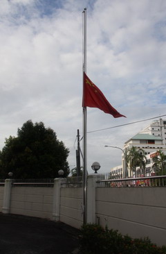 2010年8月15日,中國駐古晉總領(lǐng)館舉行下半旗儀式,向甘肅舟曲特大山洪泥石流遇難同胞表示深切哀悼。當(dāng)天,總領(lǐng)館全體館員及家屬衣著樸素,停止一切公共娛樂活動,同全國人民一道沉痛悼念舟曲遇難同胞。