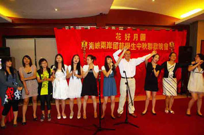 在中國(guó)傳統(tǒng)節(jié)日—中秋節(jié)即將來(lái)臨之際,為豐富海峽兩岸留菲學(xué)生的業(yè)余生活,加強(qiáng)兩岸留菲學(xué)生的情感交流,中國(guó)駐菲使館于2010年9月19日組織了一場(chǎng)“花好月圓-海峽兩岸留菲學(xué)生中秋聯(lián)歡晚會(huì)”,約120余名兩岸留菲學(xué)生歡聚一堂,在馬尼拉共度中秋佳節(jié)。駐菲律賓大使劉建超出席聯(lián)歡晚會(huì)并與同學(xué)們促膝交談。